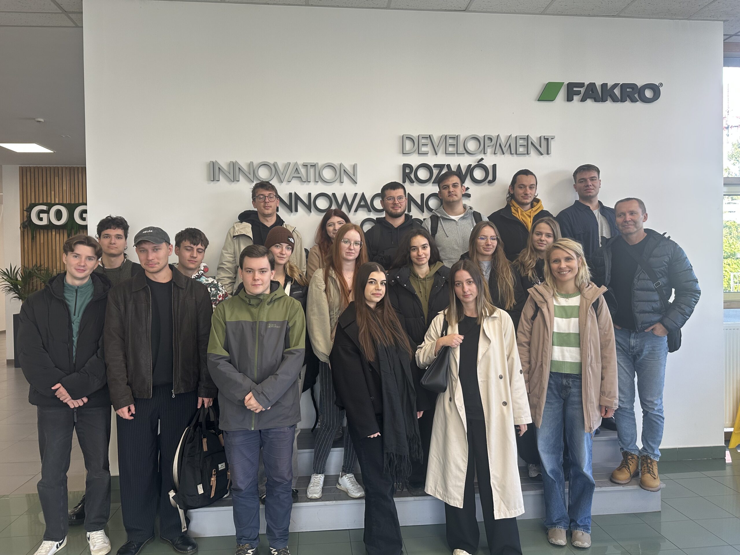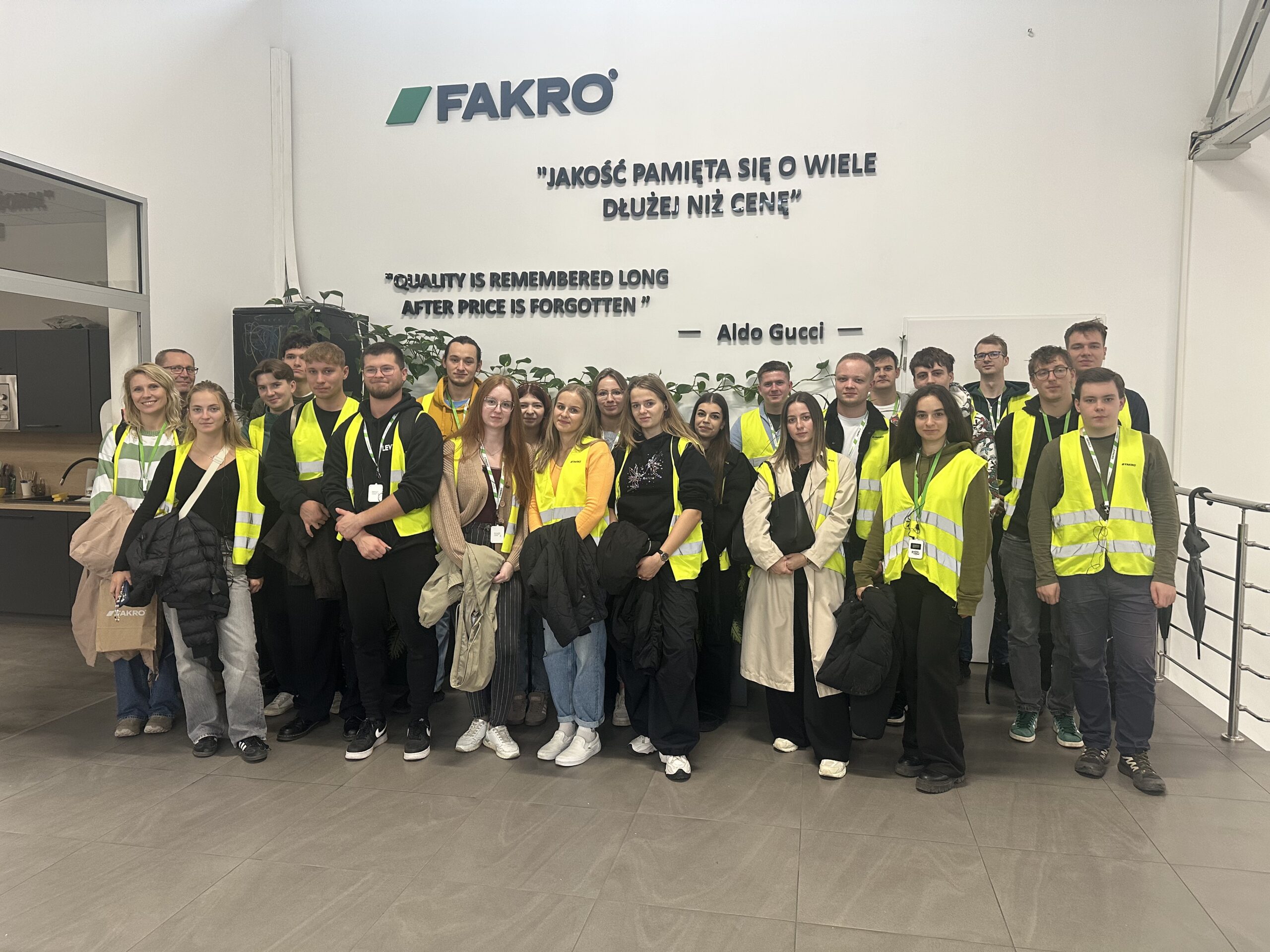W dniu 30 października 2025 roku, studenci czwartego roku z profilu dyplomowania TO wraz z pracownikami Katedry L-7 wzięli udział w wyjeździe do przedsiębiorstwa FAKRO w Nowym Sączu. Fakro oferuje całą grupę innowacyjnych rozwiązań dedykowanych do poddaszy i jest międzynarodową korporacją, która dzisiaj zajmuje pozycję wicelidera na światowym rynku okien dachowych [www.fakro.pl]. Studenci mieli okazję poznać historię i wartości firmy, zobaczyć showroom z oferowanymi produktami a także przyjrzeć się z bliska procesom produkcji i kontroli jakości.